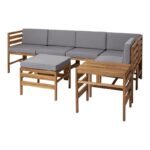 Eco-friendly meets patio with this stunning seven-piece, modular, outdoor conversation set. Responsibly harvested, solid acacia wood shapes the sleek, safari-inspired, two-toned build. UV and weather-resistant cushions complete the chic-global look that will last. Not to mention the removable cushions covers are machine washable. Two armchairs, an ottoman, three armless chairs, and a side table are yours to design however you like as they’re constructed with segmental frames. Arrange pieces in an L-shaped couch, a clean single line, or a fun, square set up. The possibilities are endless! Put the earth—and your style—first and rest easy knowing you’ve welcomed home a responsible purchase.