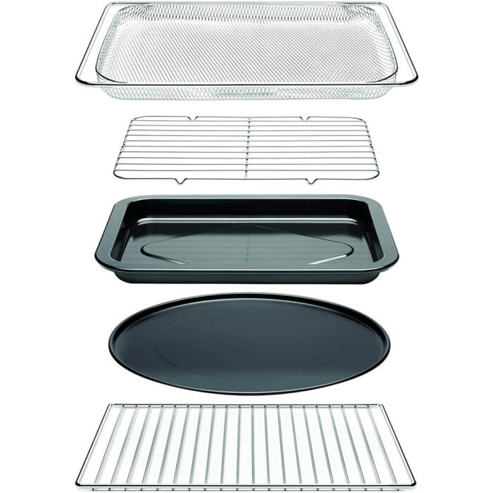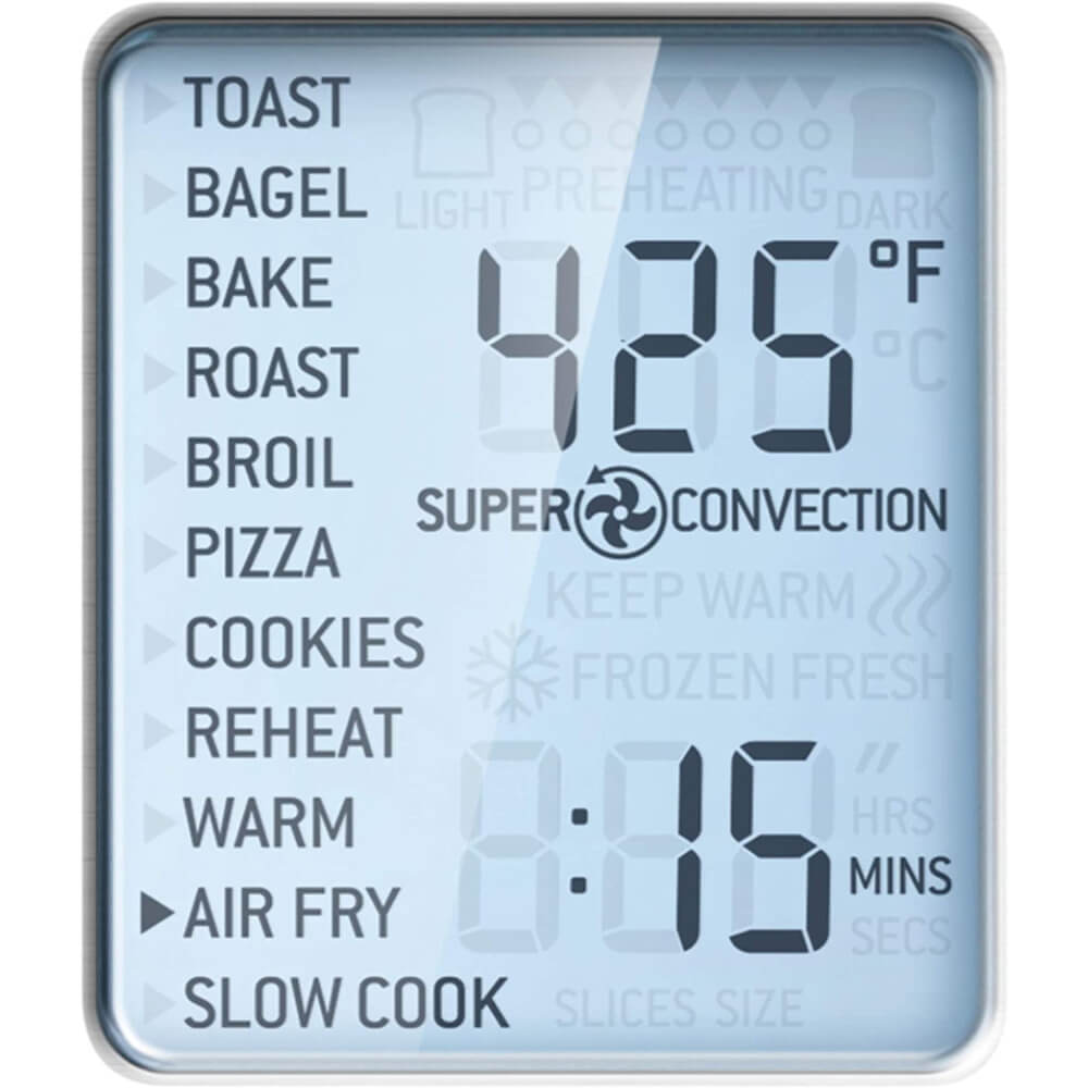 11 cooking functions to guide you to perfection: Toast 6 slices, Bagel, Broil, Bake, Roast, Warm, Pizza, Air Fry, Reheat, Cookies and Slow Cook for long cook times, at low temperatures.