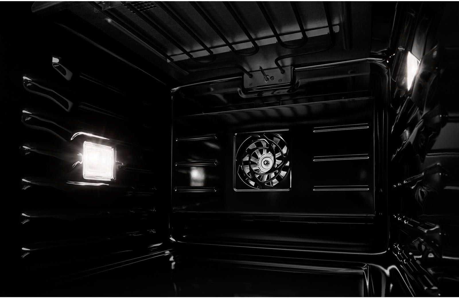 Captivation cloaked in black. Beyond a dark glass expanse, cinematic lighting illuminates smooth racks, flat tines, and an enticing jet-black interior.