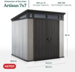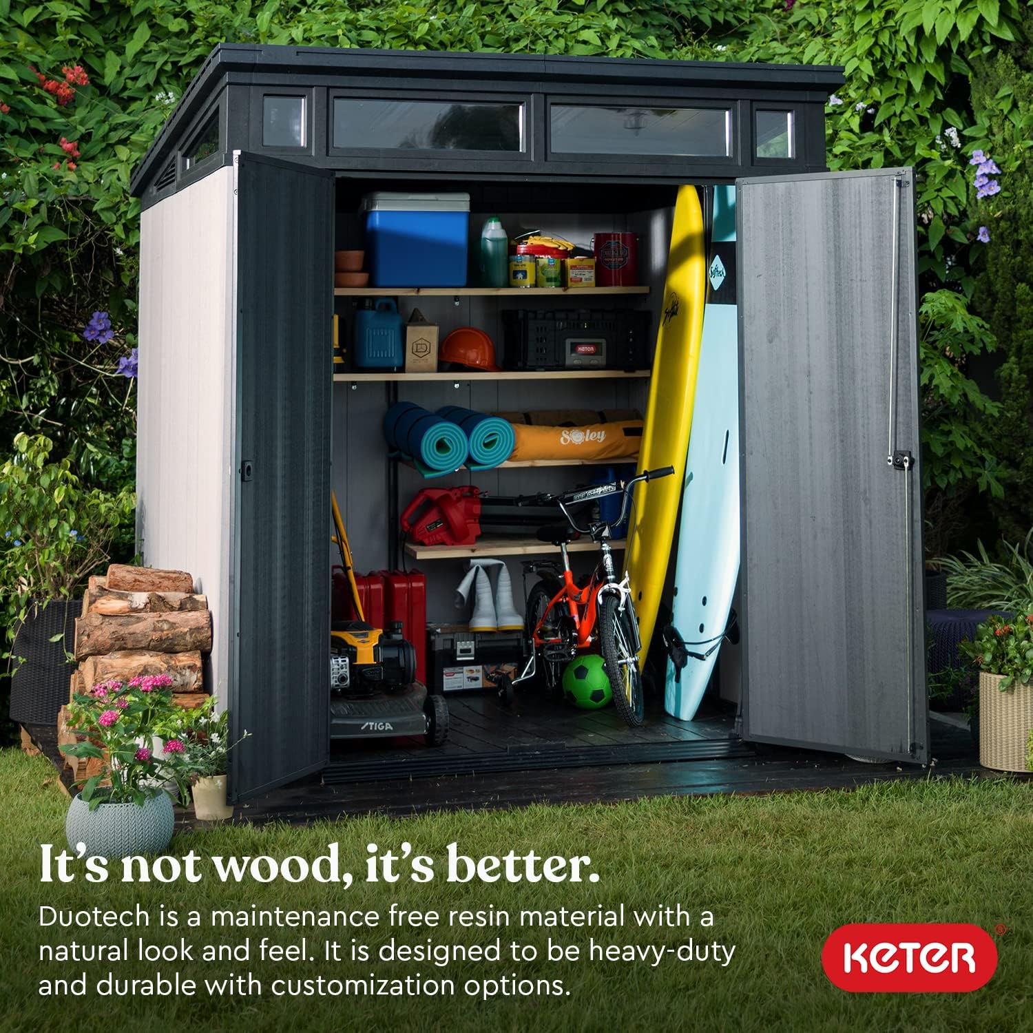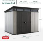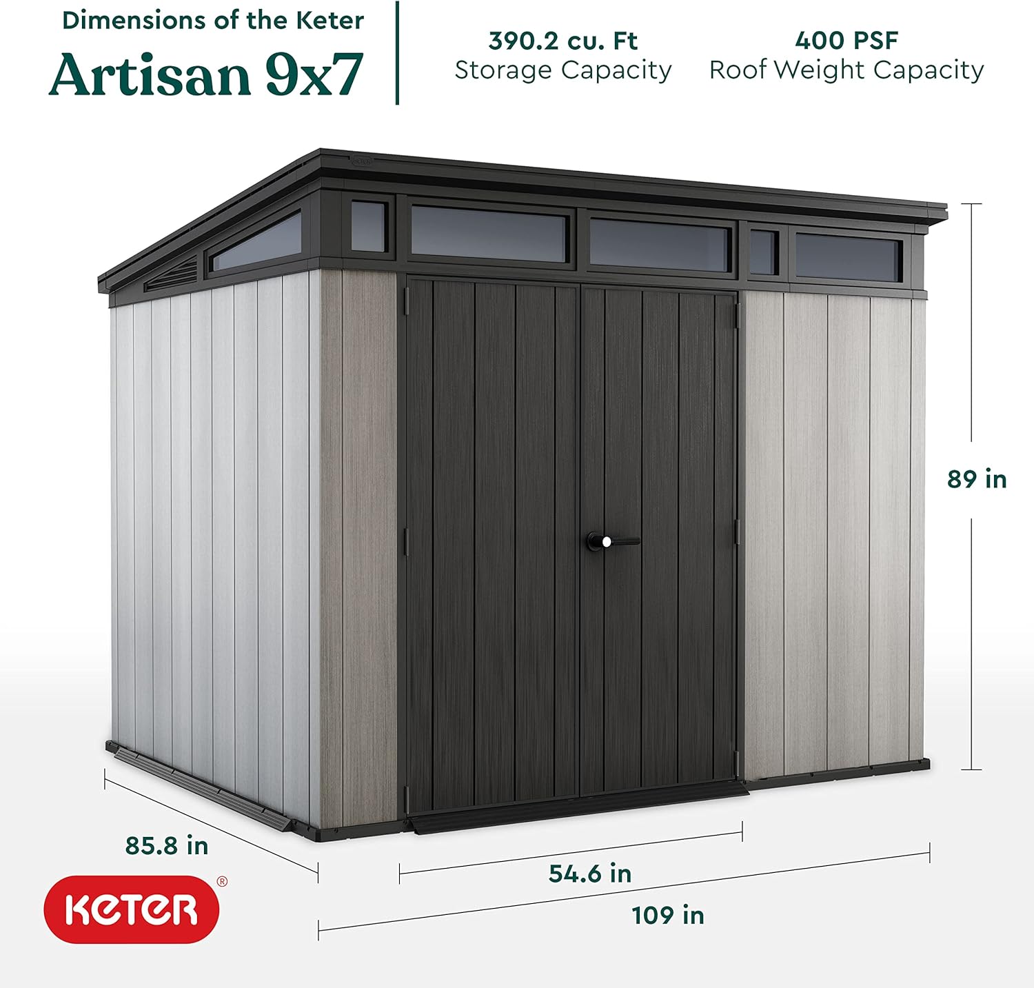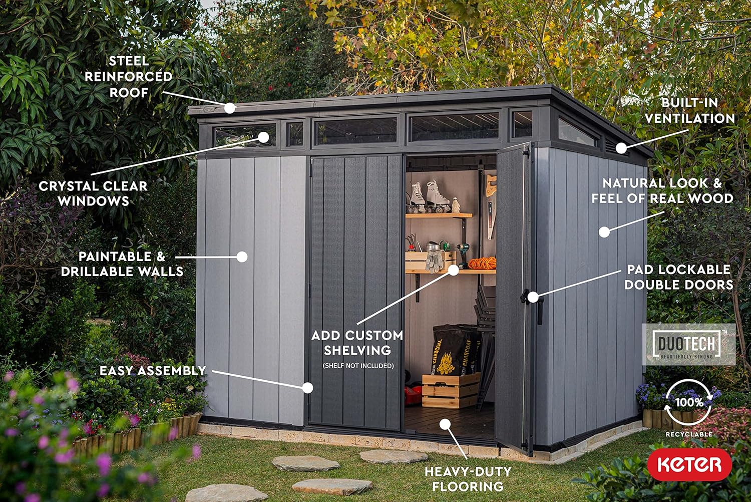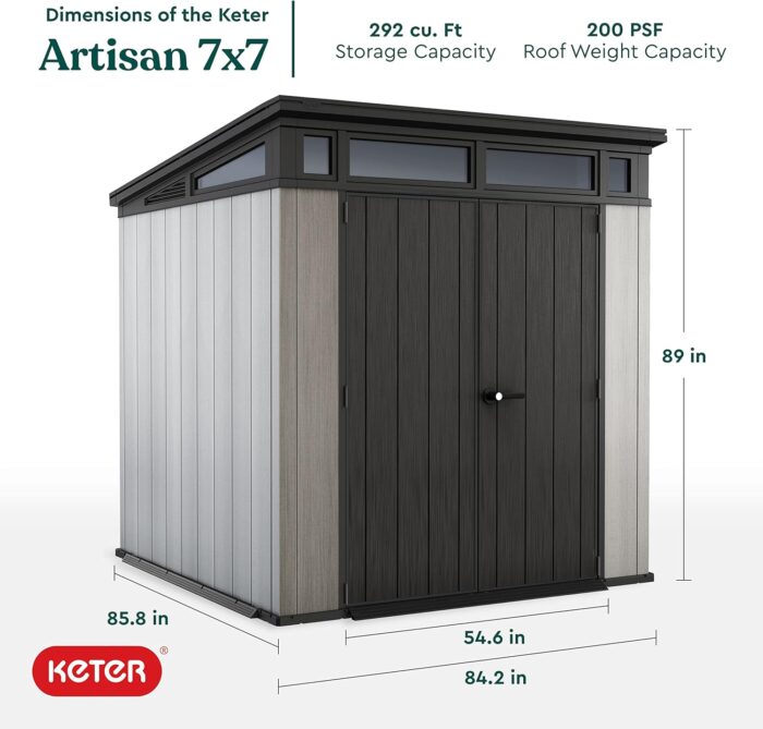 Keter Artisan 7 x 7 Foot Large Modern Design Outdoor Shed with Floor for Outdoor Furniture, Lawn Equipment, Bikes, and Gardening Tools, Gray