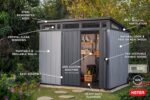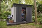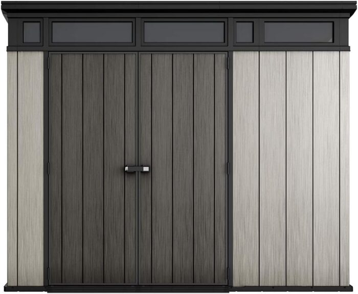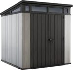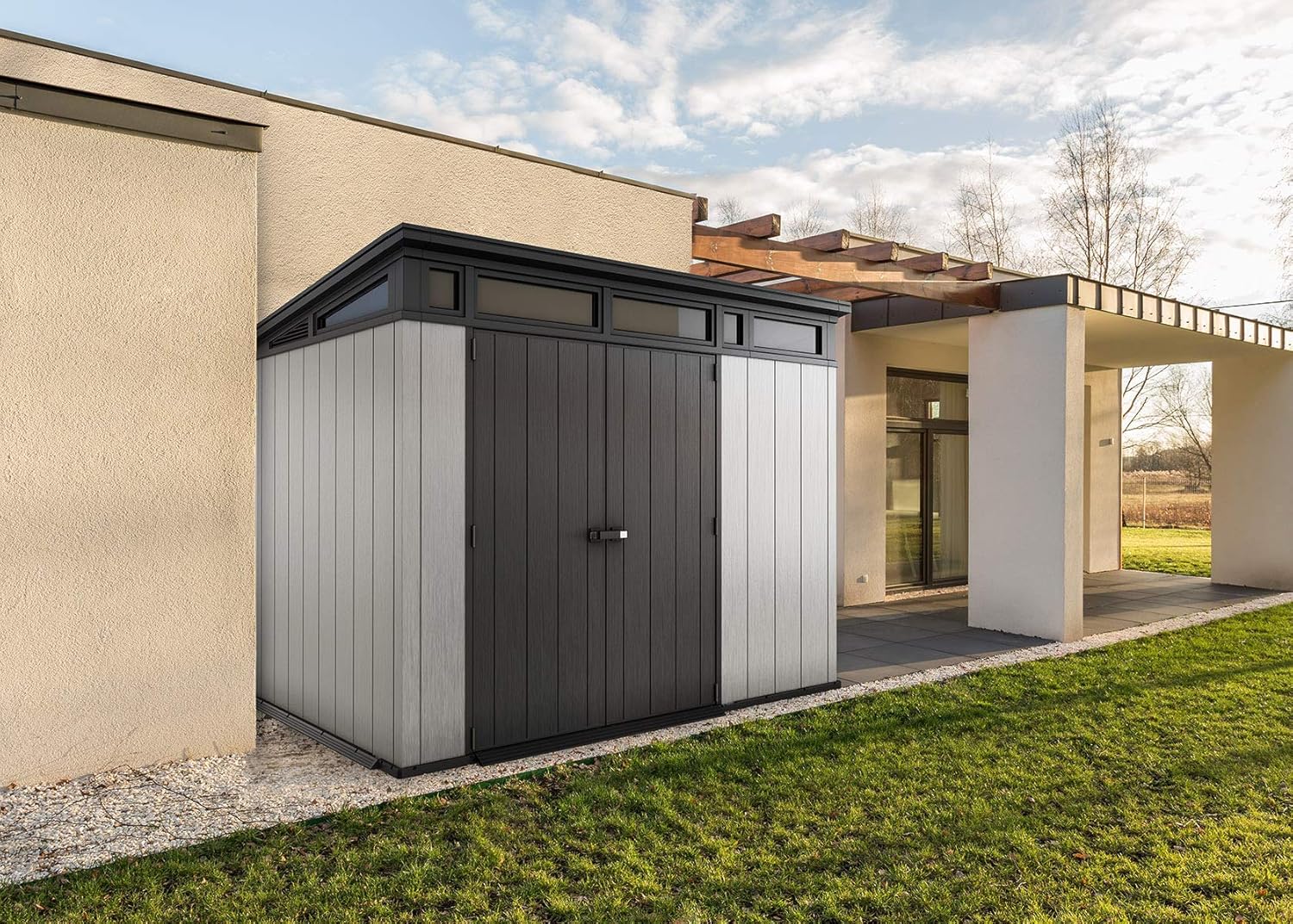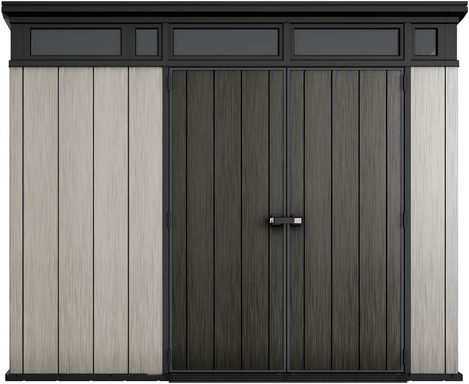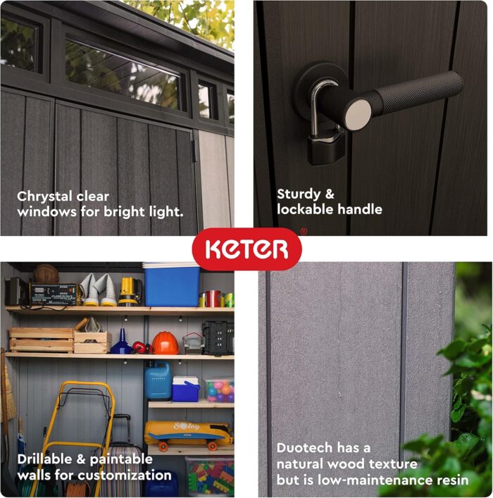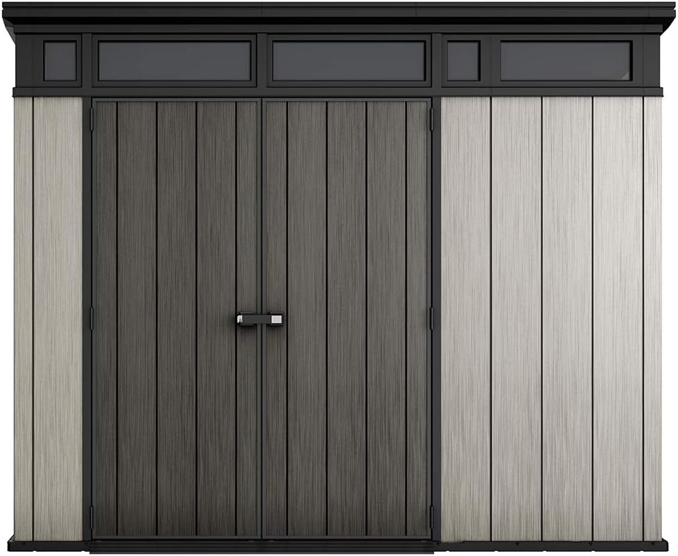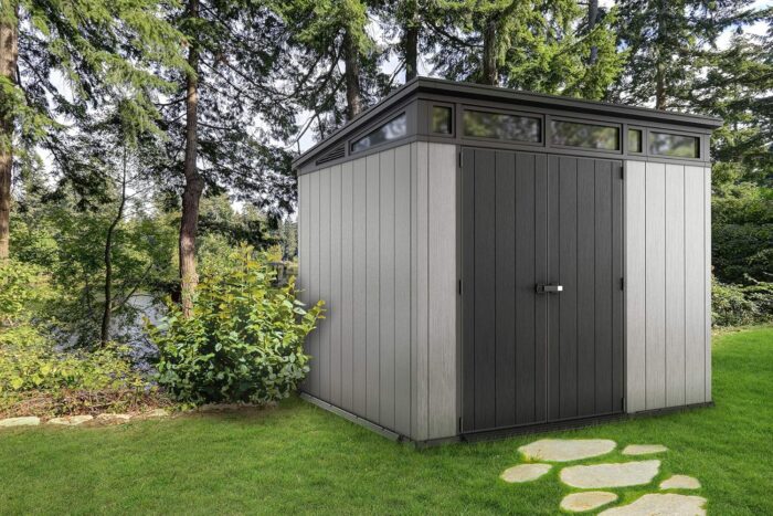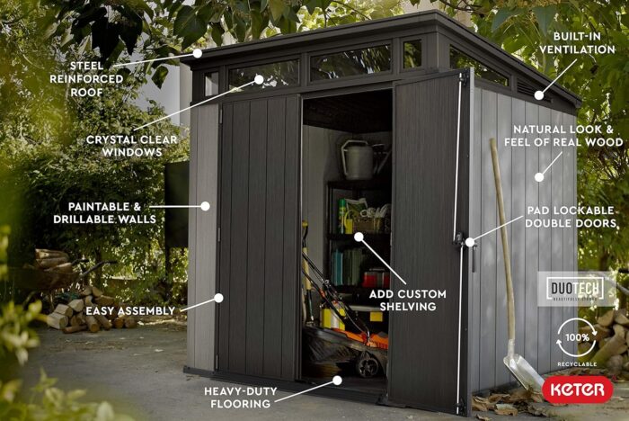 Keter Artisan 7 x 7 Foot Large Modern Design Outdoor Shed with Floor for Outdoor Furniture, Lawn Equipment, Bikes, and Gardening Tools, Gray