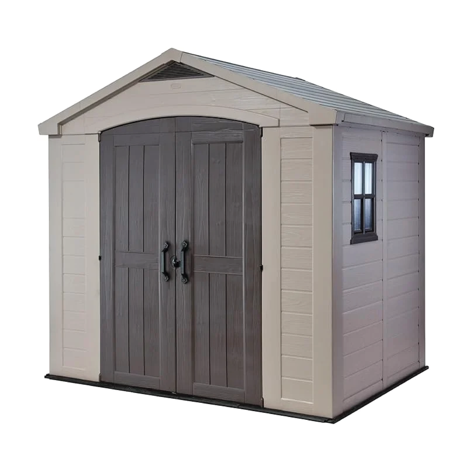 Is your garage cluttered with garden tools, step ladders, or lawn furniture. Do you need some extra room to store your push lawn mower. The Factor 8×6 resin shed from Kester Plastic provides the extra space you require at a price you can afford. The Factor 8×6 shed is easy to assemble and lasts far longer than wooden sheds because it won’t rot, crack, or warp under the elements. With a Kester shed, you never have to worry about termites or other pests and the Factor shed is completely maintenance free. To clean an outdoor Kester storage shed, simply wipe it down with a damp cloth several times or lightly hose off the exterior. There’s no need for expensive chemical cleaners. You can use the shed 8×6 shed to store your rakes, shovels and other tools. The large double door opening makes storing your riding lawn mower. an easy task and leaves plenty of room for your other things. With a fixed window, skylight and extended roof line, the shed won’t feel claustrophobic or dark and the air vents near the roof ensure that gasoline and other chemical fumes won’t build up over time.
