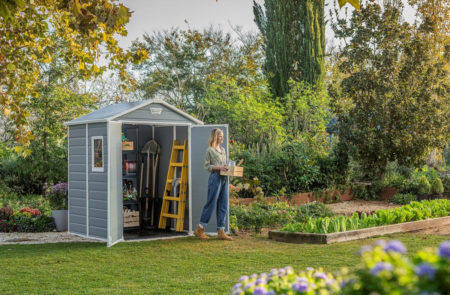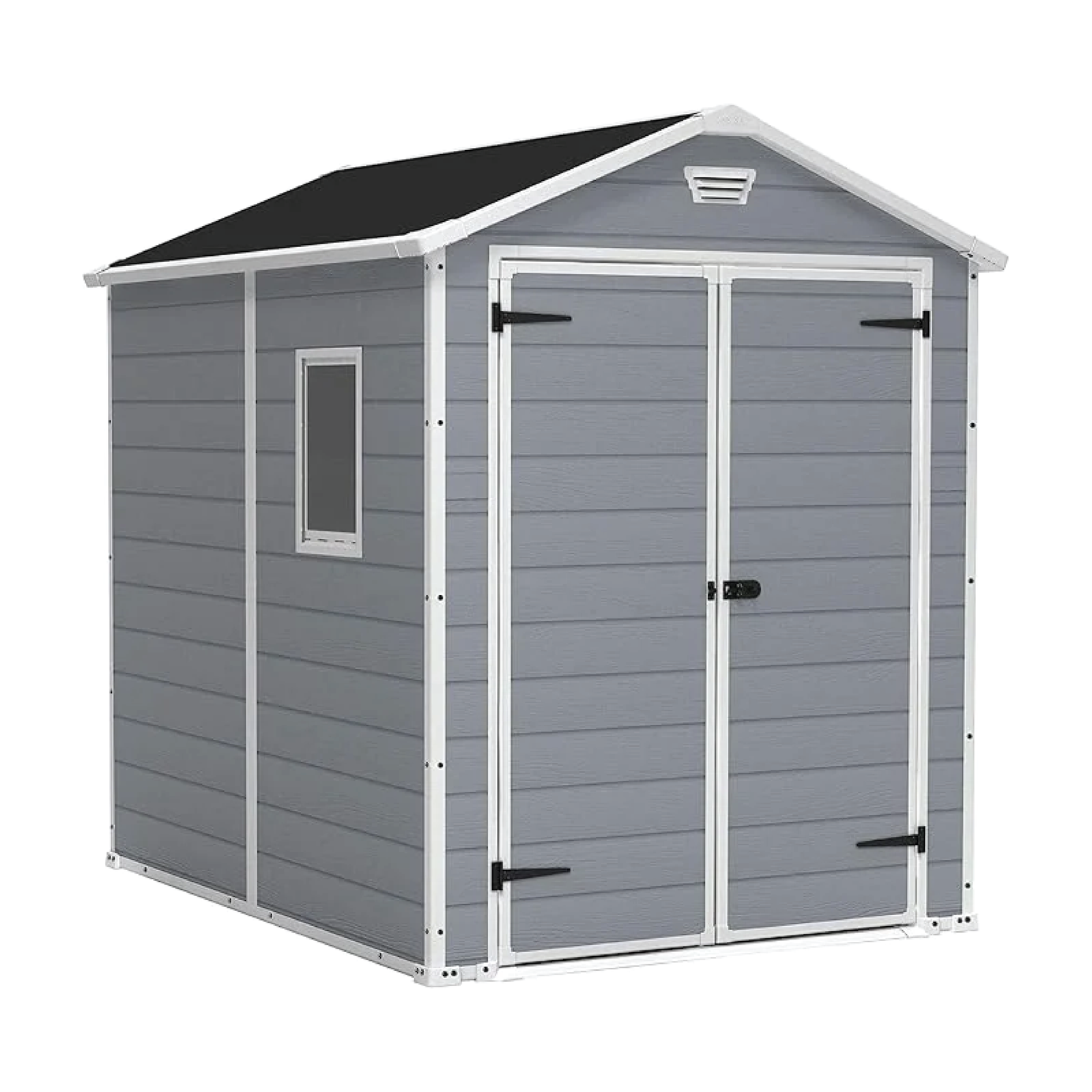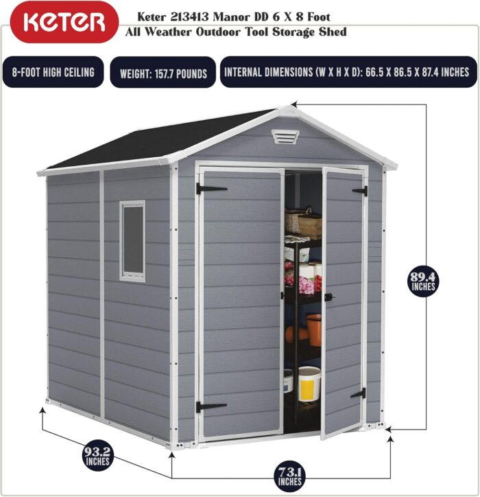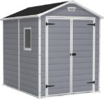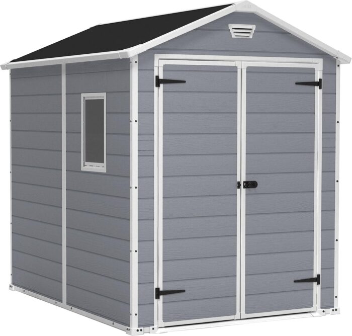 Keter Manor 6×8 Foot All Weather Garden Tool Outdoor Storage Shed with Lockable Double Doors, Fixed Window and Wood-look Resin Walls, Grey