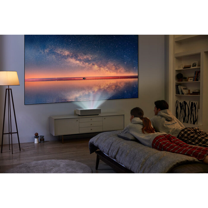 With 4K UHD resolution, 2500 ANSI lumens, HDR10 support, embedded LG Smart TV and more, The LG HU715QW Ultra short throw projector has it all. In addition to features that tech enthusiasts love, this Laser projector creates a powerful picture – even in under ambient lighting conditions – while only occupying a small amount of space. Just place it on any surface, 7. 1 inches from the wall, and immediately jump to a breathtaking 120-inch 4K UHD screen. Netflix, You Tube, Disney+, Prime Video, Apple TV compatible.