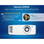 Immerse yourself with stunning true 4K UHD images from the incredibly bright, 4,000 lumens Optoma UHD38 home entertainment and gaming projector. The UHD38 delivers a lightning-fast input lag as low as 4.2ms and a high refresh rate of 240Hz – perfect for a competitive gaming advantage.Console gamers will enjoy 1080p 120Hz or 4K UHD 60Hz game play with the newest Microsoft Xbox Series X|S and Sony Playstation 5 for blur-free visuals and outstanding smoothness. TV and movie fans can also enjoy excellent color depth, crystal clear detail, and sparkling contrast for a stunningly immersive experience.Packed with the latest technology and features, this stylish projector boasts High Dynamic Range (HDR), HLG compatibility, and an 8-segment color wheel to produce vivid, cinematic images ideal for home entertainment. Perfect for enjoying life-like big-screen entertainment up to a 300 inch image in any living space.