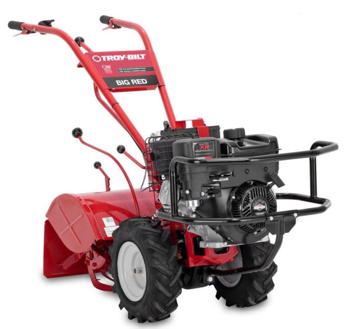 The Troy-Bilt Big Red is equipped for the heaviest-duty jobs in gardens over 2,500 square feet. It will start when you need it with electric start. Work at your pace with 4 forward speeds and maneuver with 2 reverse speeds and a neutral option.